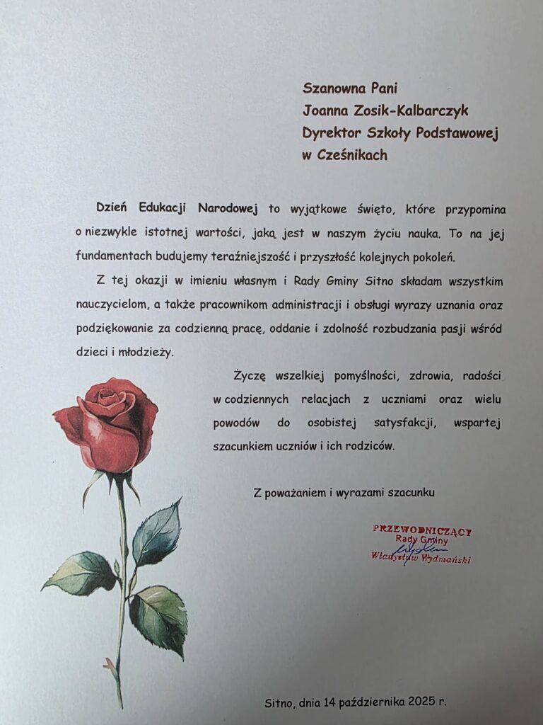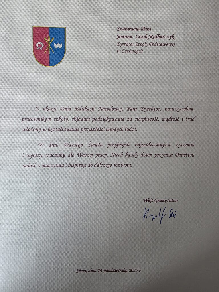 Serdecznie dziękujemy Panu Wójtowi oraz Radzie Gminy za pamięć i życzenia z okazji Dnia Edukacji Narodowej.